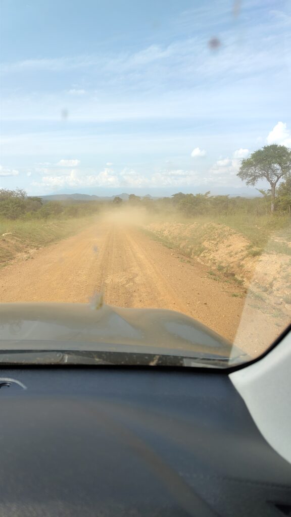 So ging es also letzten Dienstag um 6:30 Uhr los. 300km hören sich für europäische Verhältnisse, wenn man an eine schöne Autobahn mit Durchschnittsgeschwindigkeiten von 110 km/h denkt, noch schaffbar an. Ft. Mark wollte mir jedoch unbedingt eine „Abkürzung“ zeigen, die um einiges schneller ist. Sagen wir so. Er hatte recht. Es war ein bisschen schneller. Aber die Bezeichnung „unbefestigte Landstraße“ wäre schon eine große Übertreibung. So ging es teilweiße durch Schlamm und Erde oft mit einer Geschwindigkeit von unter 15 km/h. Es war anstrengend, da man mit der Konzentration natürlich voll da sein musste aber es war auch sehr abenteuerlich. So habe ich es mir Safaris immer vorgestellt und ich habe endlich verstanden, wozu Stoßdämpfer gebraucht werden.